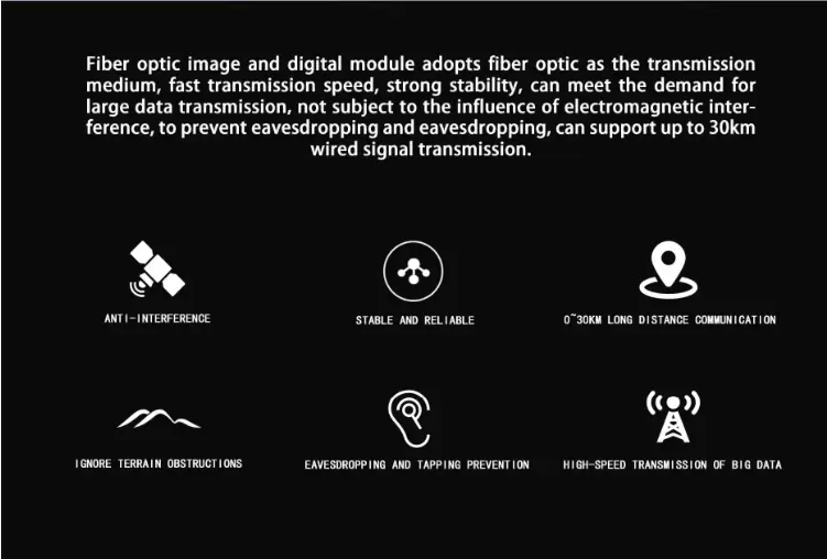 Эта профессиональная оптическая система передачи данных, интегрированная в БПЛА (с катушкой оптоволокна), поддерживает гибкие диапазоны (от 3 до 40 км). Благодаря высокой надежности и компактной конструкции, она обеспечивает стабильную передачу данных на средних и коротких расстояниях, отвечая строгим требованиям промышленных задач к помехоустойчивости и пропускной способности.