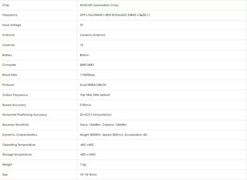 Foxeer M10Q 120 GPS — это высокопроизводительный навигационный модуль, специально разработанный для радиоуправляемых самолетов и FPV-дронов, оснащенный усовершенствованным чипом 10-го поколения (M10), который обеспечивает точную и надежную навигацию; он поддерживает несколько созвездий, включая GPS L1, ГЛОНАСС L1, BDS B1, Galileo E, SBAS L1 и QZSS L1 для широкополосного точного позиционирования, поставляется со встроенным компасом QMC5883 для предоставления точных данных о направлении (гарантируя стабильный полет даже в сложных магнитных условиях) и высокопроизводительной керамической антенной (с чувствительностью трассировки -166 дБм и чувствительностью захвата -160 дБм) для улучшенного обнаружения и стабильности сигнала, а также предлагает поддержку двойного протокола NMEA/UBX для легкой интеграции с различными системами и настраиваемую выходную частоту от 1 Гц до 10 Гц (по умолчанию 10 Гц) для удовлетворения различных потребностей; Что касается технических характеристик, то он имеет входное напряжение 5 В, скорость передачи данных 115200 бит/с, точность измерения скорости 0,05 м/с, точность горизонтального позиционирования 1,5 м (на открытом воздухе), динамические характеристики, включая максимальную высоту 50000 м, максимальную скорость 500 м/с и максимальное ускорение 4g, диапазон рабочих температур от -40 °C до +85 °C, диапазон температур хранения от -40 °C до +105 °C, вес всего 2,7 г и размеры 12,5 * 17 * 5 мм, в комплект поставки входят 1x GPS-модуль M10Q 120 и 1x комплект кабелей.